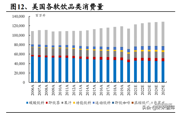 包装水符合美国的健康化诉求,不断瓜分碳酸饮料市场。2020 年,美国包装 水消费量再达历史新高,碳酸饮料连续第 6 年缩减。根据 Euromonitor,2020 年美国包装水及碳酸饮料消费量分别为 431 亿升及 433 亿升,二者体量趋近, 差距进一步缩小。同时,美国包装水人均消费量逐年提升。根据 Euromonitor,2020 年,美国人均包装水及碳酸饮料消费量分为 130.2 升/人及 130.6 升/人, 包装水及碳酸饮料的人均消费量接近。根据 Euromonitor 预计,未来包装水 将超越碳酸饮料成为美国消费量第一的软饮品类。