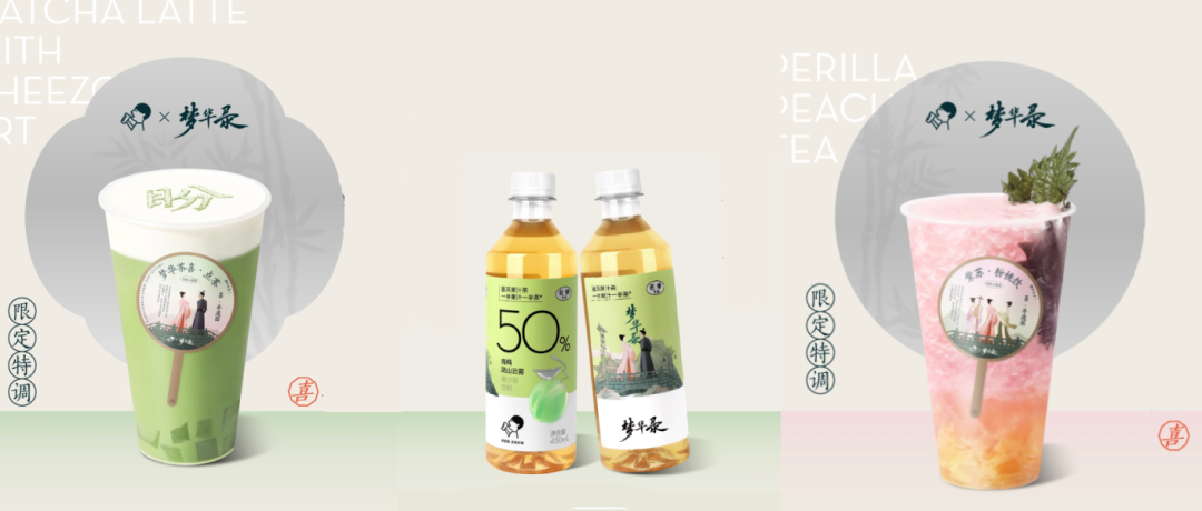 近日,喜茶与梦华录联名推出新品:2款现制茶饮梦华茶喜·点茶和紫苏·粉桃饮,以及1款瓶装青梅果汁茶。据品牌介绍,梦华茶喜·点茶融合了真奶与抹茶,辅以手工现制抹茶冻,以喜茶经典芝士铺顶,并用抹茶粉作画,茶味醇厚;紫苏·粉桃饮选用由新鲜紫苏叶煮制的紫苏水,口感鲜香,搭配水蜜桃鲜果与绿妍冰沙,清新甜润。此外,品牌预告将在7月3日官宣推出瓶装低糖青梅果汁茶,规格为450ml/瓶。