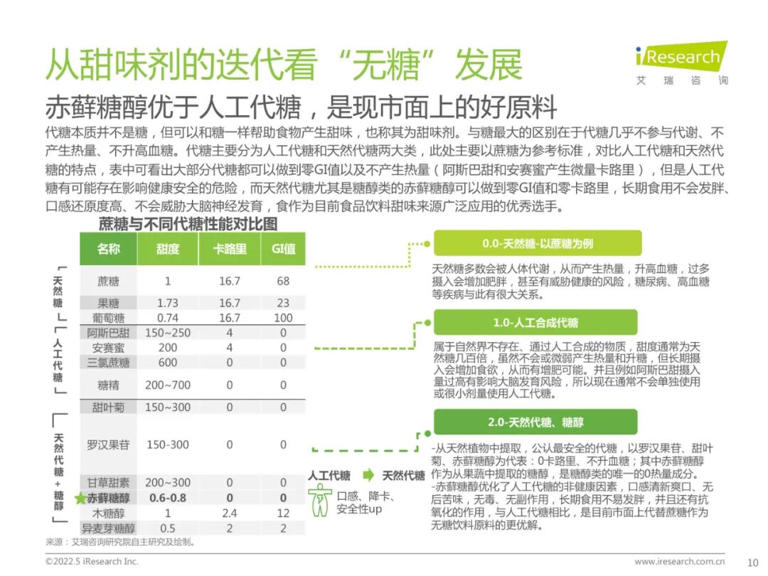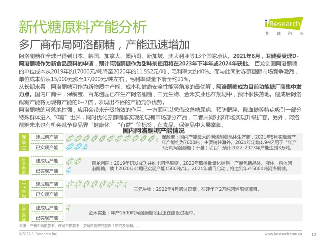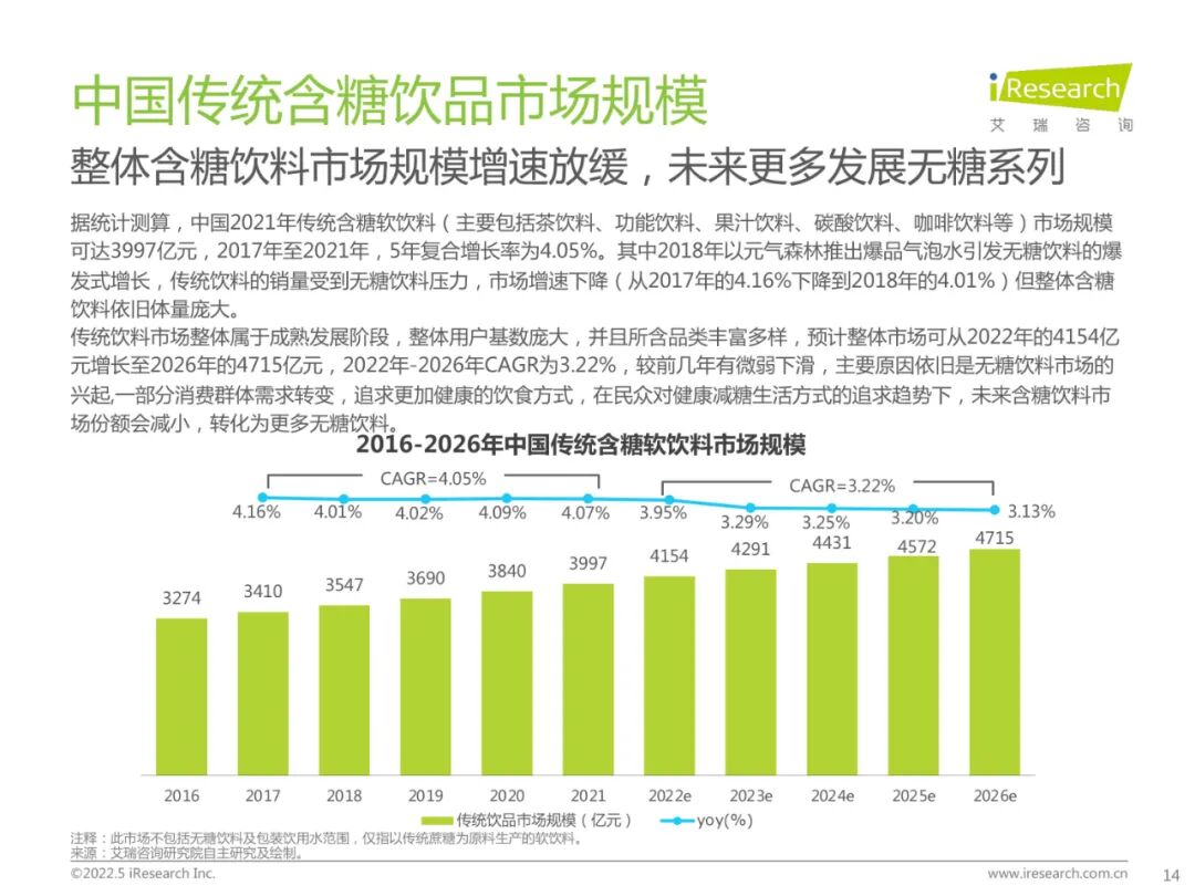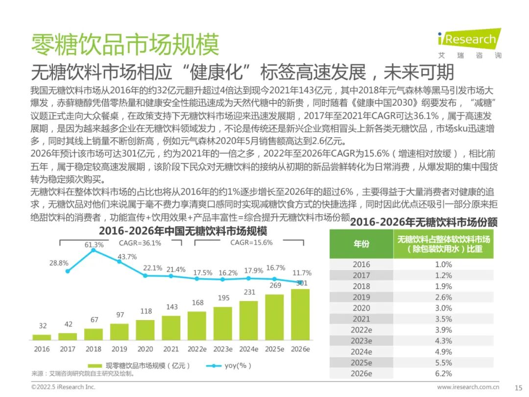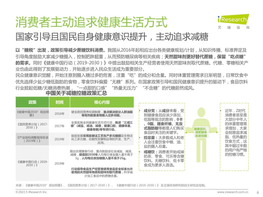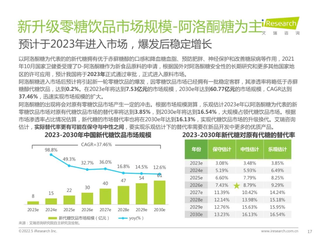 随着时间的迁移:糖工业化生产以及人民生活质量升级,糖的摄入从稀缺变为过多,糖逐渐成为负担。肥胖率、相关疾病患病率同步上升,严重威胁人类身体健康。为应对此现象国家出台相关政策鼓励大家控制糖摄入量,同时民众开始主动追求健康的意识提升,减糖/去糖化掀起热潮,有一点甜的口感”“热量无压力”“不含糖”的代糖蔚然成风。根据艾瑞测算,至2026年,现有物质发展下无糖饮品市场可达301亿元,同时科研和企业端会持续不断发现、研发更优秀的新物质,例如阿洛酮糖,预计新物质的批准还会激发新增量市场,假设阿洛酮糖2023年进入市场,将会在未来五年引来爆发增长,2030年新物质带来的无糖饮品市场规模可达约60亿元。我们相信研发选取真正符合健康安全且保证口感的原料、建立新产品线与用户求健康高度匹配给予消费者新体验、不断创新横纵拓展市场产品布局会带给市场更多发展空间。
