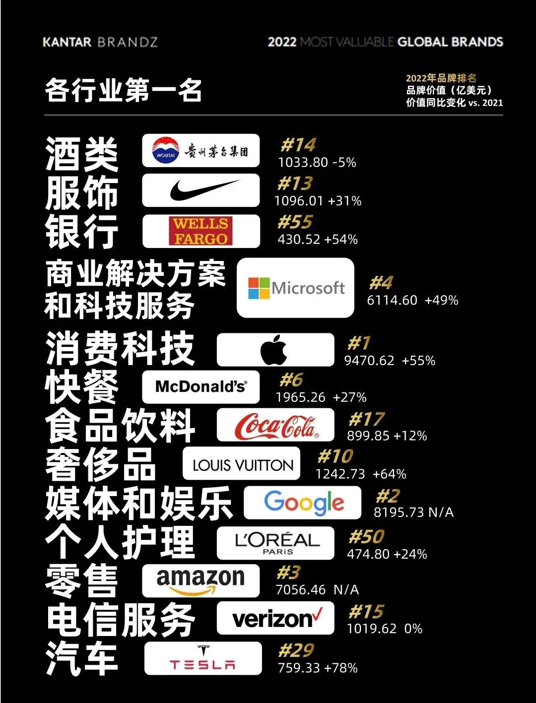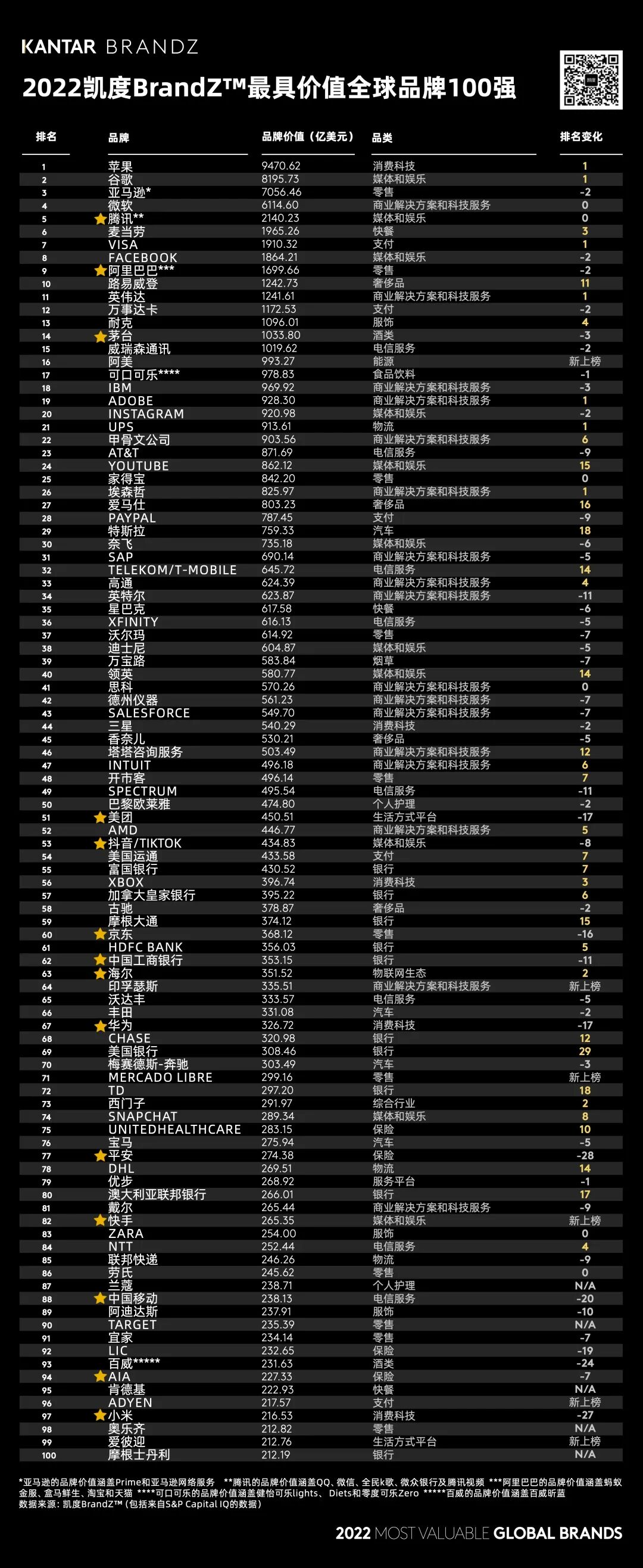 今日,全球品牌数据与分析公司凯度集团最新发布了2022年凯度BrandZ™最具价值全球品牌排行榜。