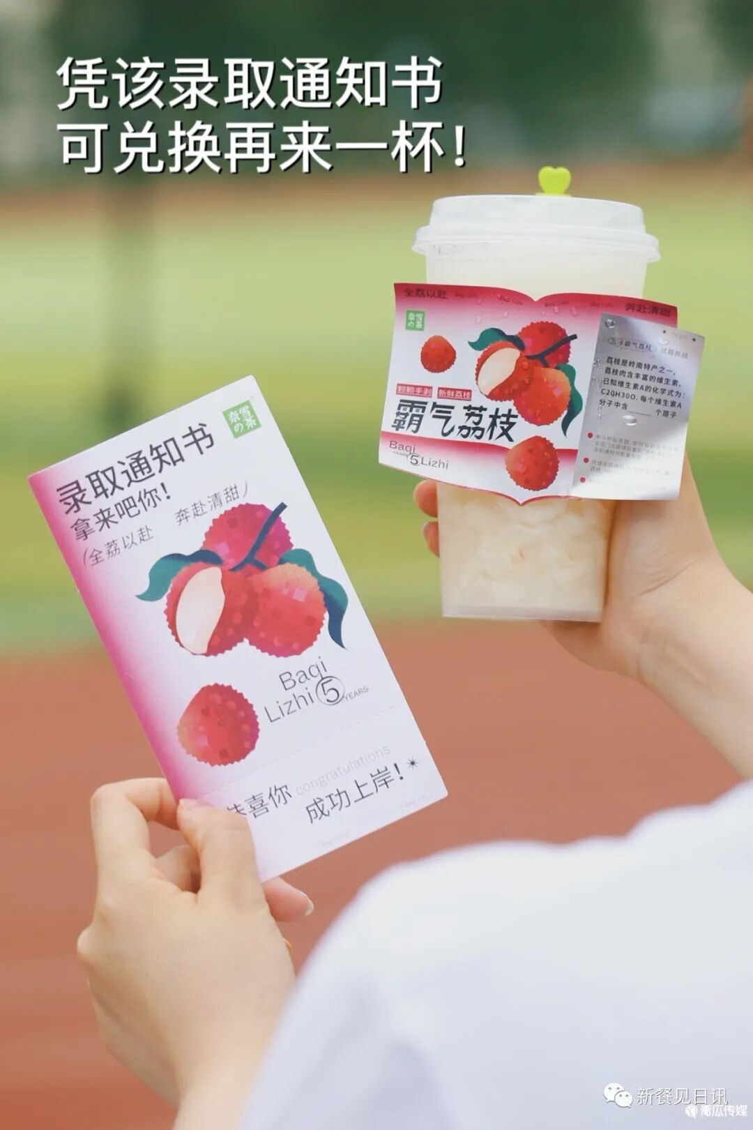 今年,奈雪的茶借势高考,上新「全荔以赴 奔赴清甜」系列霸气荔枝与荔枝生椰拿铁。在这两款饮品杯贴上,印了一些高考挑战题目,只要答对上面的考题,便可获得“录取通知”,消费者可凭此向门店兑现“再要一杯”的福利,新奇又有趣。
