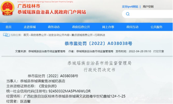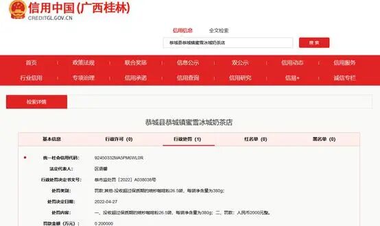 国家企业信用信息公示系统显示:恭城县恭城镇蜜雪冰城奶茶店因原料过期,被恭城瑶族自治县市场监督管理局罚款2000元,并没收超过保质期的焙炒咖啡粉26.5袋,每袋净含量为380g。