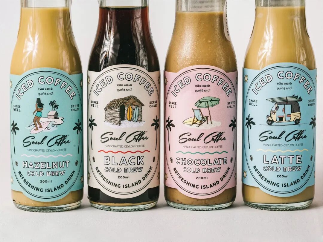 SOUL COFFEE这款即饮冰咖啡的瓶身采用了玻璃瓶的材质,瓶身酷似一瓶果汁,瓶盖的设计类似于罐头盖,让人觉得小巧、可爱。这款源于斯里兰卡的咖啡在瓶身的图案设计上有其独特的灵感出处。斯里兰卡是海岛国家,冲浪文化盛行,设计者在设计这款冰咖啡时从斯里兰卡的冲浪文化中汲取灵感。插图上绘制的是斯里兰卡常见的冲浪场景,融合清爽、梦幻的配色,迎合了夏日海岛上炎热、浪漫氛围。在海边冲浪闲憩时,倘若手捧一瓶这样的即饮冰咖啡,光是从视觉享受上就已感受到清凉。