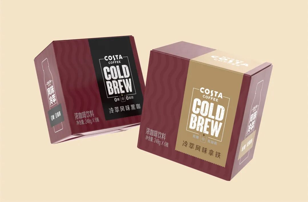 COSTA这款冷萃即饮咖啡采用金属铝瓶的包装设计,作为一款随行杯咖啡,它携带方便、形态美观。瓶身的背景底色延续COSTA一贯的代表色——复古深红,与深沉黑以及质感金的瓶盖搭配,再附上白色的标签字体,高级、优雅、简洁、高端,加强了包装的品质感,也表现了COSTA对品位的执着。