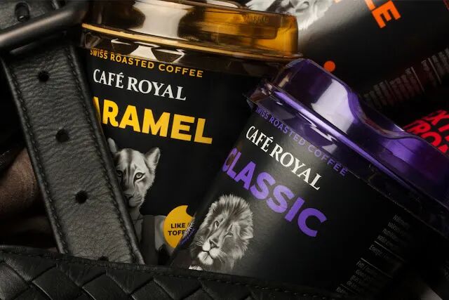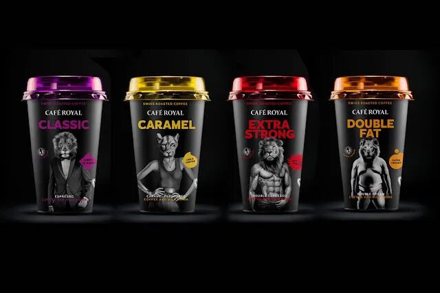 CAFÉ ROYAL这款即饮冰咖啡的包装上最引人注目的是其包装上拟人化的狮子。狮子是CAFÉ ROYAL品牌的商标,蕴含着该品牌勇敢和时尚的特征。包装上不同身材的狮子以及不同的配色代表着不同的咖啡风味和产品属性,极具张力。在配色的选择上,CAFÉ ROYAL同样十分大胆,紫、黄、红色都是鲜艳且饱和度高的颜色,与品牌的定位相呼应,也表达着咖啡因即将在你体内创造的强大能量!