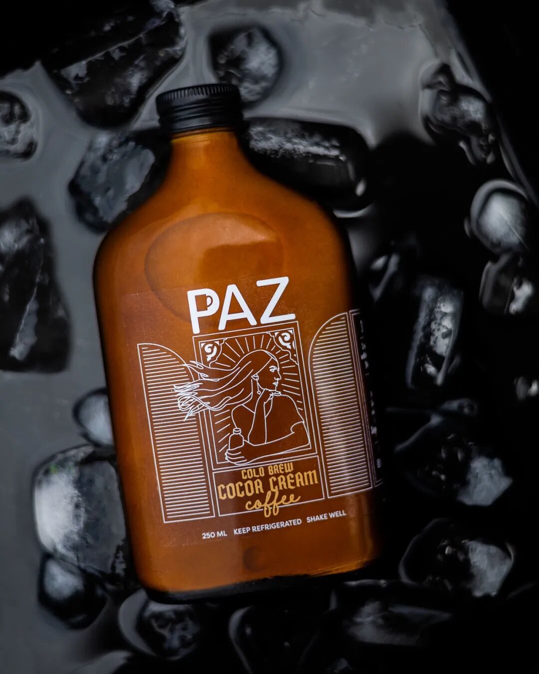 PAZ Coffee这款冷萃即饮咖啡的瓶身形状酷似酒瓶,加上深咖色的瓶身,也许你会认为里面装着的是类似威士忌的某种烈酒,这正是它的吸引人之处。玻璃瓶身上的字体和插画以白色为主色调,插画绘制的是一位加勒比海域的具有民族特色的女性手捧咖啡站在窗户前,这副插画设计既能代表咖啡产地的风格特色,又能展示这款冷萃即饮咖啡的饮用场景及其赋予消费者的舒适与清爽。