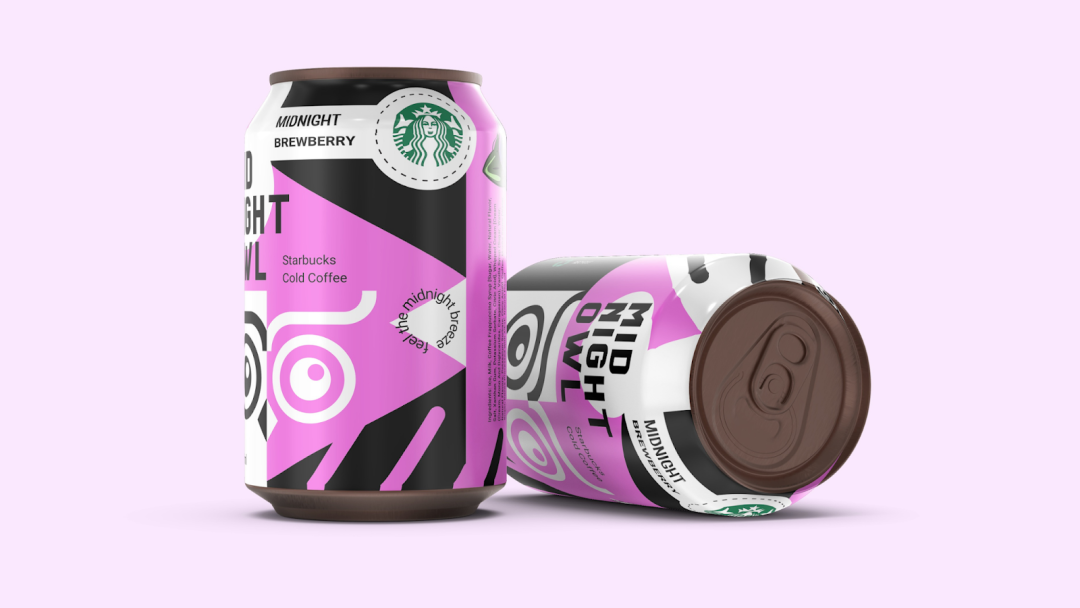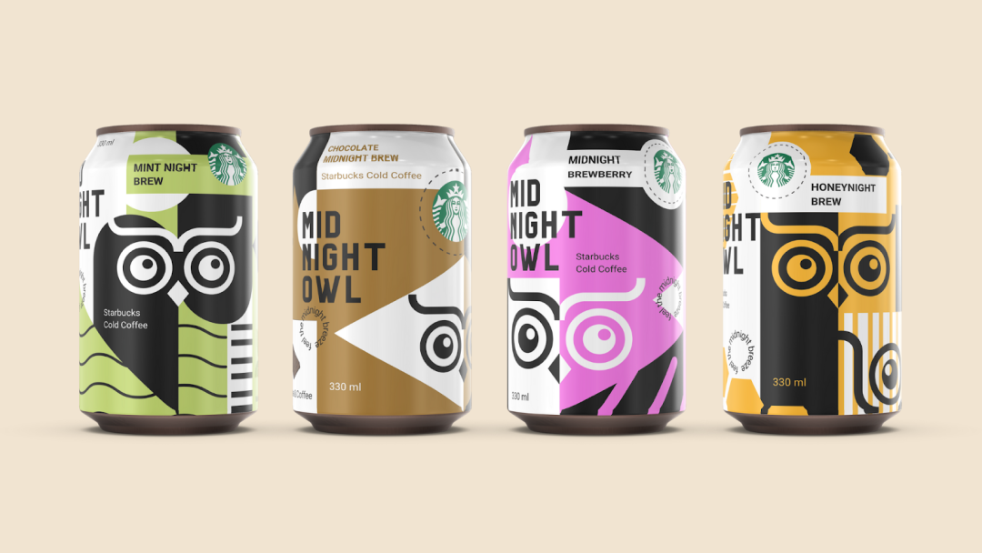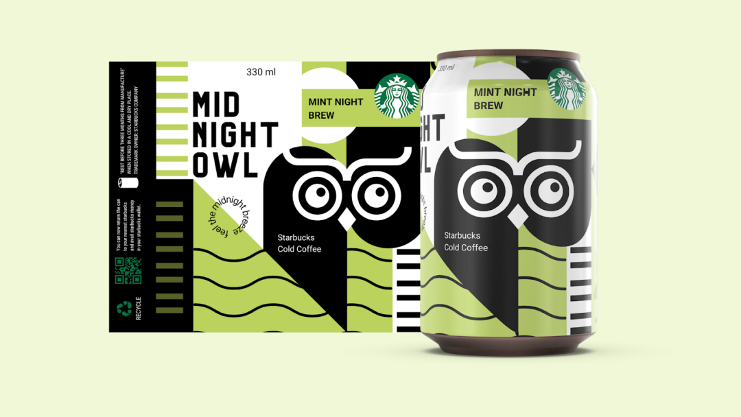 星巴克这款概念作品给即饮咖啡的包装设计增添了几抹新意。这款即饮冷咖啡由咖啡渣盒其他可再生资源制成。咖啡渣是一种可持续材料,即使使用寿命结束,也仍然可以长期使用,同时也是可生物降解的。星巴克这款冷咖啡的包装设计发挥了材料的最大使用潜力,为环保事业做出了贡献。这款即饮咖啡的瓶身分解了不同的几何图形,配色鲜艳、时尚,十分符合当下年轻人的消费需求。同时,瓶身上的猫头鹰插画设计也是这款包装设计的点睛之处,夜猫子们,这款咖啡一定是你们需要的!