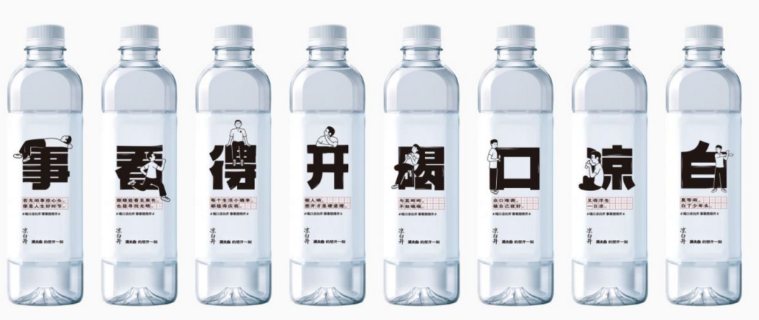 此次,凉白开全新设计了15支凉白开瓶身,用“想、了、方、我、可、玩、爽、事、看、得、喝、口、凉、白、开”15个创意文字随心搭配,自由表达心中所想。