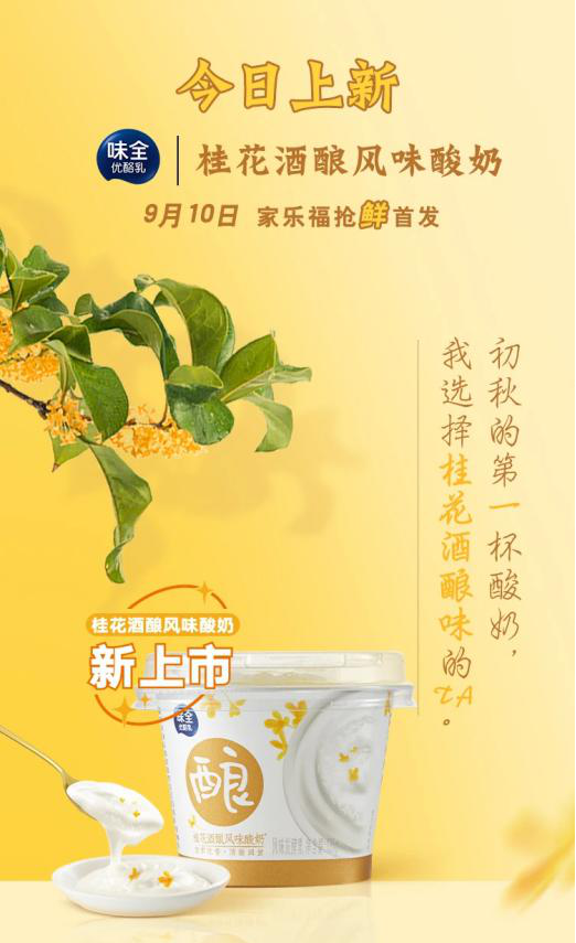 9月10日教师节当天,味全在其官方微信公众号发布了一款新品——桂花酒酿风味酸奶。作为“秋天的第一杯酸奶”,该款新品以桂花香气为主打,带来秋日美食疗愈感,同时甄选北纬31.92°国家地理标志产品“朱湖珍珠糯米”,酿造出甘甜米酒,最后融入100%生牛乳发酵的纯浓酸奶,一勺入口,两勺赏味。