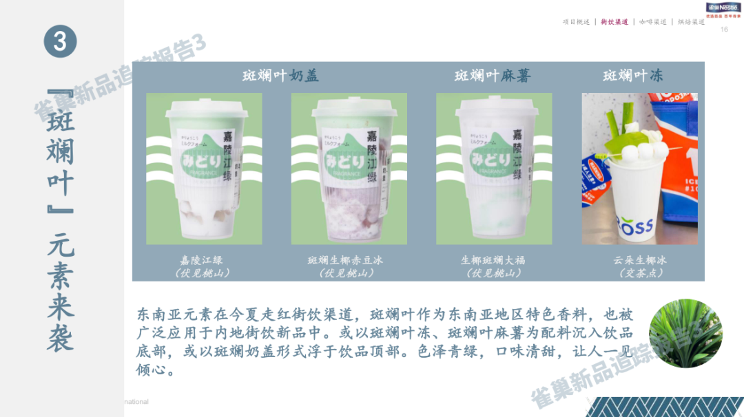 东南亚元素在今夏走红街饮渠道,斑斓叶作为东南亚地区特色香料,也被广泛应用于中国内地街饮新品中。