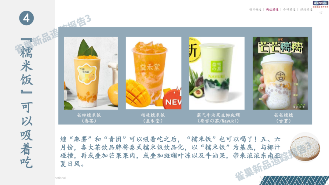 五六月份,各大茶饮品牌将泰式糯米饭饮品化,以“糯米饭”为基底,与椰汁碰撞,再或叠加芒果果肉,或叠加斑斓叶冻以及牛油果,带来浓浓东南亚夏日风。