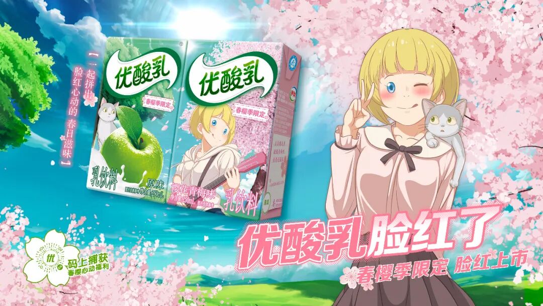 近日,国民潮饮优酸乳便创新性推出“春樱季限定”——樱花青梅味新品,并与优酸乳樱花包装原味组合成颜值CP。这款有颜有料的“季节限定”极具网红潜力,受到了广大年轻消费者的追捧。