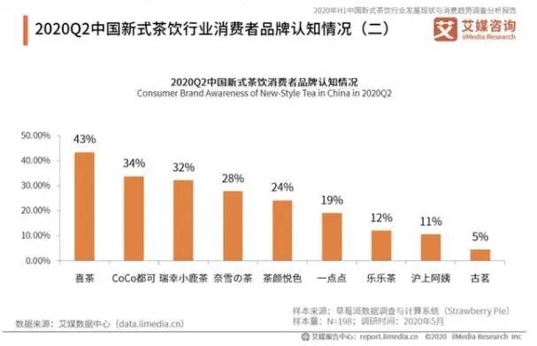 根据艾媒咨询下半年发布的《2020年中国新式茶饮行业发展状况与消费趋势调查报告》显示,2020 Q2中国新式茶饮消费者品牌认知情况排名为喜茶(43%)、CoCo都可(43%)、瑞幸小鹿茶(32%)、奈雪的茶(28%)、茶颜悦色(24%)、一点点(19%)、乐乐茶(12%)、沪上阿姨(11%)以及古茗(5%)。