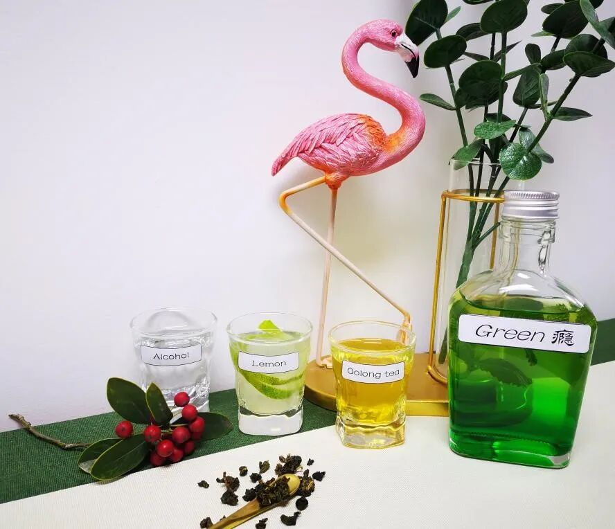 以青柠檬调味、薄荷叶提香、乌龙茶打底,制作一款有果香、有茶感的酒风味饮料。入口薄荷的清凉感充斥着整个口腔,乌龙的清香茶感给饮品的中段奠定了扎实的基调,尾段由酒精带来的那一点点烈,喝一口,Green瘾!茶酒融合正当时,饮品本身的酒精度含量在2%-3%之间,创新性的将清香型乌龙茶底结合酒元素,充分体现茶、酒文化的相互融合与交流。
