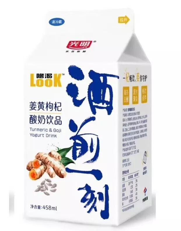 除了蒙牛,光明旗下的LOOK系列也推出了一款解酒酸奶——酒前一刻。“酒前一刻”创新将姜黄、枸杞两大药食同源原料融入酸奶中,利用姜黄、枸杞解酒护肝的优势,专为餐前酒后的消费场景而研制。“酒前一刻”瞄准商务应酬、派对聚会、家庭餐饮等消费场景。
