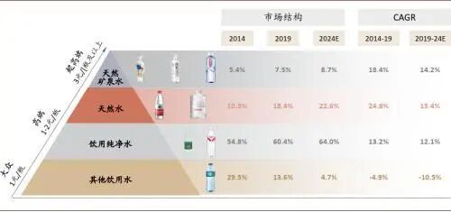 根据沙利文,2014-2019年天然水和天然矿泉水市场零售额CAGR分别达24.8%和18.4%,其合计销售占比从2014年的15.7%攀升至2019年的25.9%,2024年有望进一步上升至31.3%。我们认为天然(矿泉)水由于其健康属性将继续跑赢整个行业。