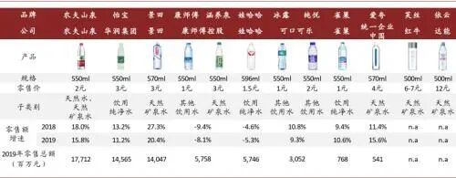 欧睿咨询数据显示,农夫山泉在整个行业中具有主导型地位。天然(矿泉)水细分市场中的企业,如农夫山泉和百岁山,过去两年增长步伐更快,显示出消费者对饮用天然(矿泉)水的意识逐步提升。另外,下图表明消费者亦愿意为天然(矿泉)水支付溢价。天然矿泉水零售价格在每瓶3-12元之间,而纯净饮用水价格仅为每瓶1-2元。