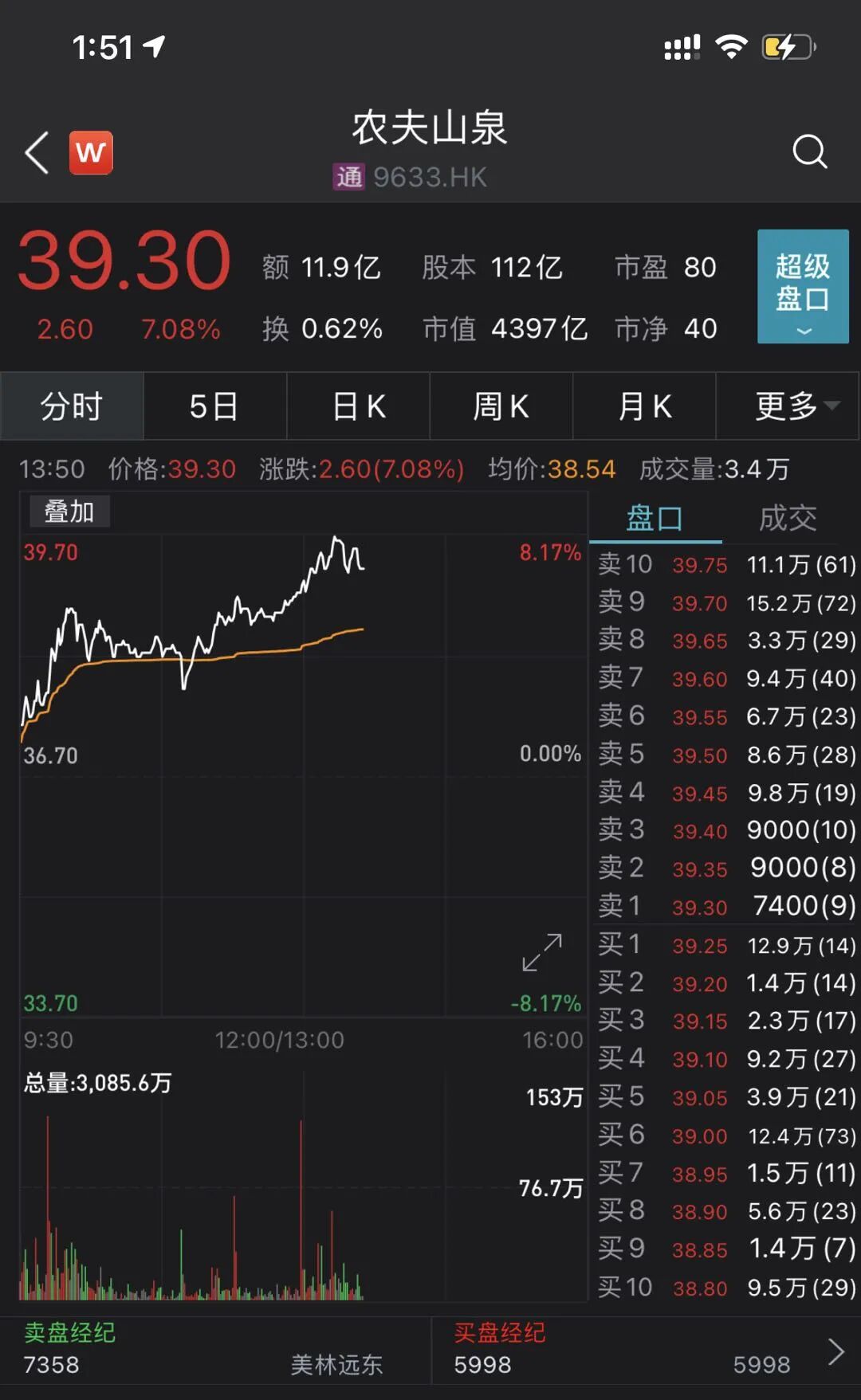 9月8日,“大自然的搬运工”农夫山泉在港交所挂牌上市,该股高开85.12%,报价39.8港元,较发行价涨幅达到85.12%,市值冲高至4452.92亿港元,成为港股食品饮料行业市值新领头羊。