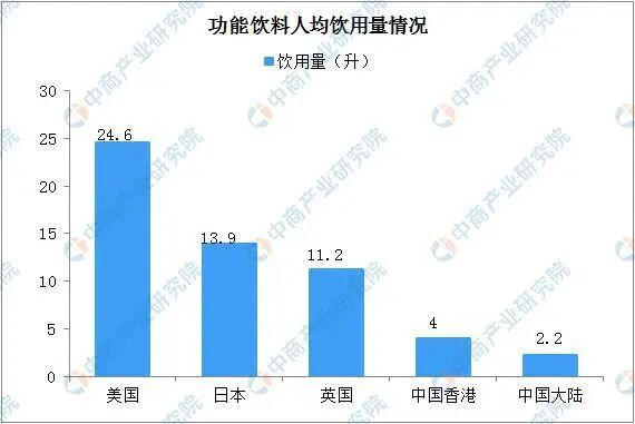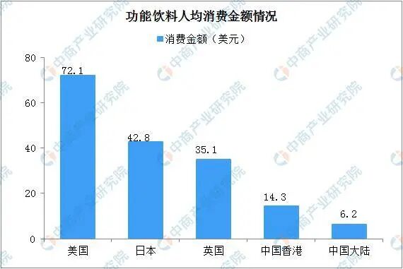 中国能量饮料市场起步晚,能量饮料的人均消费水平仍显著偏低,成长空间广阔。根据欧睿国际及中金公司研究部整理的数据,2017年中国大陆功能饮料4人均消费量为2.2升,消费金额为6.2美元,人均消费金额不足中国香港的50%,与英国、日本和美国差距更大,约10%-20%。