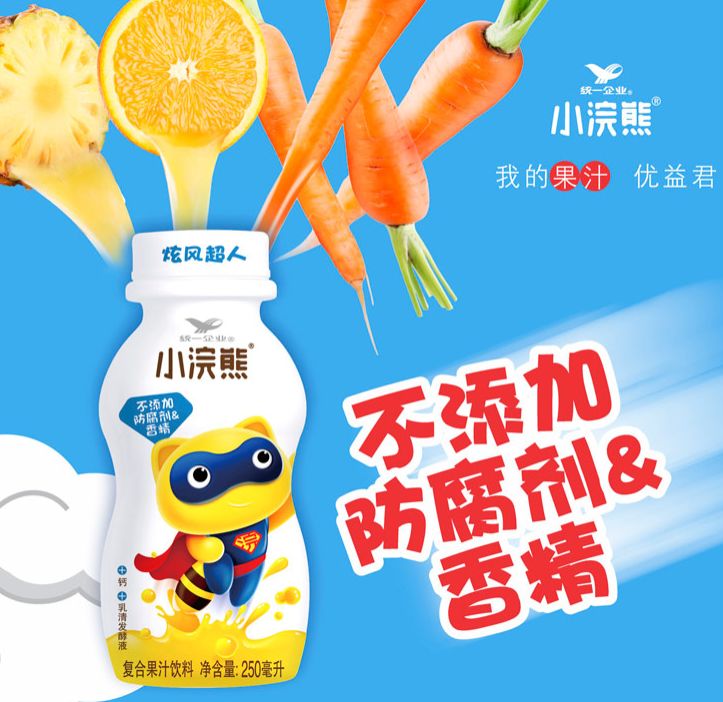 日前,统一旗下小浣熊针对儿童饮料细分市场推出一款复合果蔬汁饮料。此款饮料包含旋风超人、火眼大圣两种口味:“旋风超人”以菠萝+橙为主原料,并添加钙来促进儿童骨骼生长,同时增加乳酸菌LV108发酵液;“火眼大圣”以胡萝卜+橙为主原料,并添加维生素B6来帮助缓解眼睛疲劳。此外,其瓶身设计采用孙悟空、超人等卡通形象元素来迎合其4-12岁的目标消费群体。