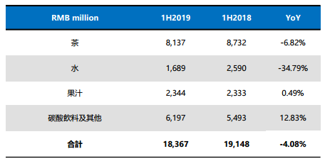 上半年饮品事业即饮茶(包含奶茶)销量市占44.8%,继续稳居市场首位。果汁销量市占14.5%,居市场第二位。包装水销量市占5.4%。