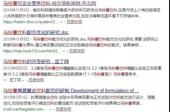 百度搜索“马铃薯饮料”,我们发现目前已经有很多有关“马铃薯饮料配方研发”公开研究资料。