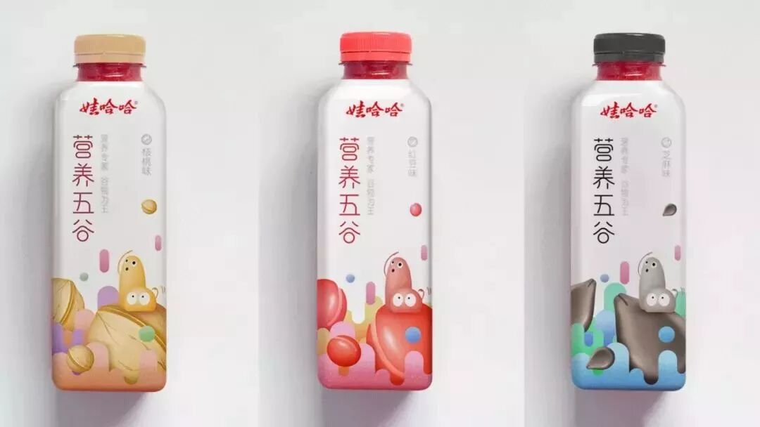 新品在口味转变的同时,包装也更加年轻化。产品采用大瓶口方形PET瓶,满足畅饮的特性,符合上班族、学生等来不及吃早饭甚至正餐,进而用营养五谷饮料进行代餐的主流消费人群的需求;设计风格上,娃哈哈也一改往日沉稳、传统的风格,采用年轻受众群体更加青睐的时尚化主题设计,插画风格的卡通谷物形象配以鲜艳的颜色,凸显了产品的活泼内涵及灵动性。