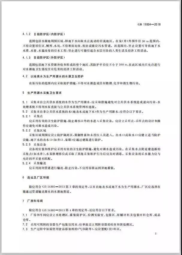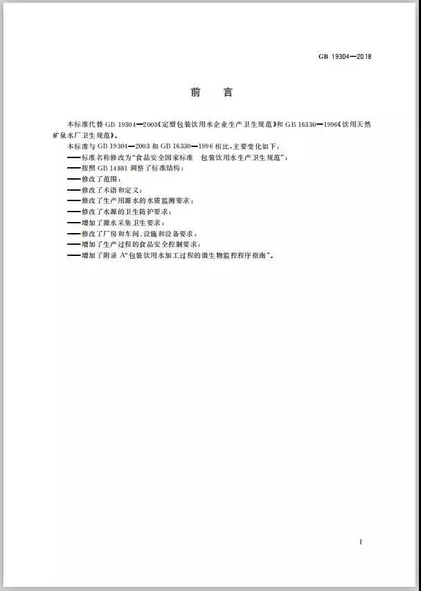 GB19304-2018《食品安全国家标准包装饮用水生产卫生规范》,代替GB19304-2003《定型包装饮用水企业生产卫生规范》和GB16330-1996《饮用天然矿泉水厂卫生规范》,主要变化如下: