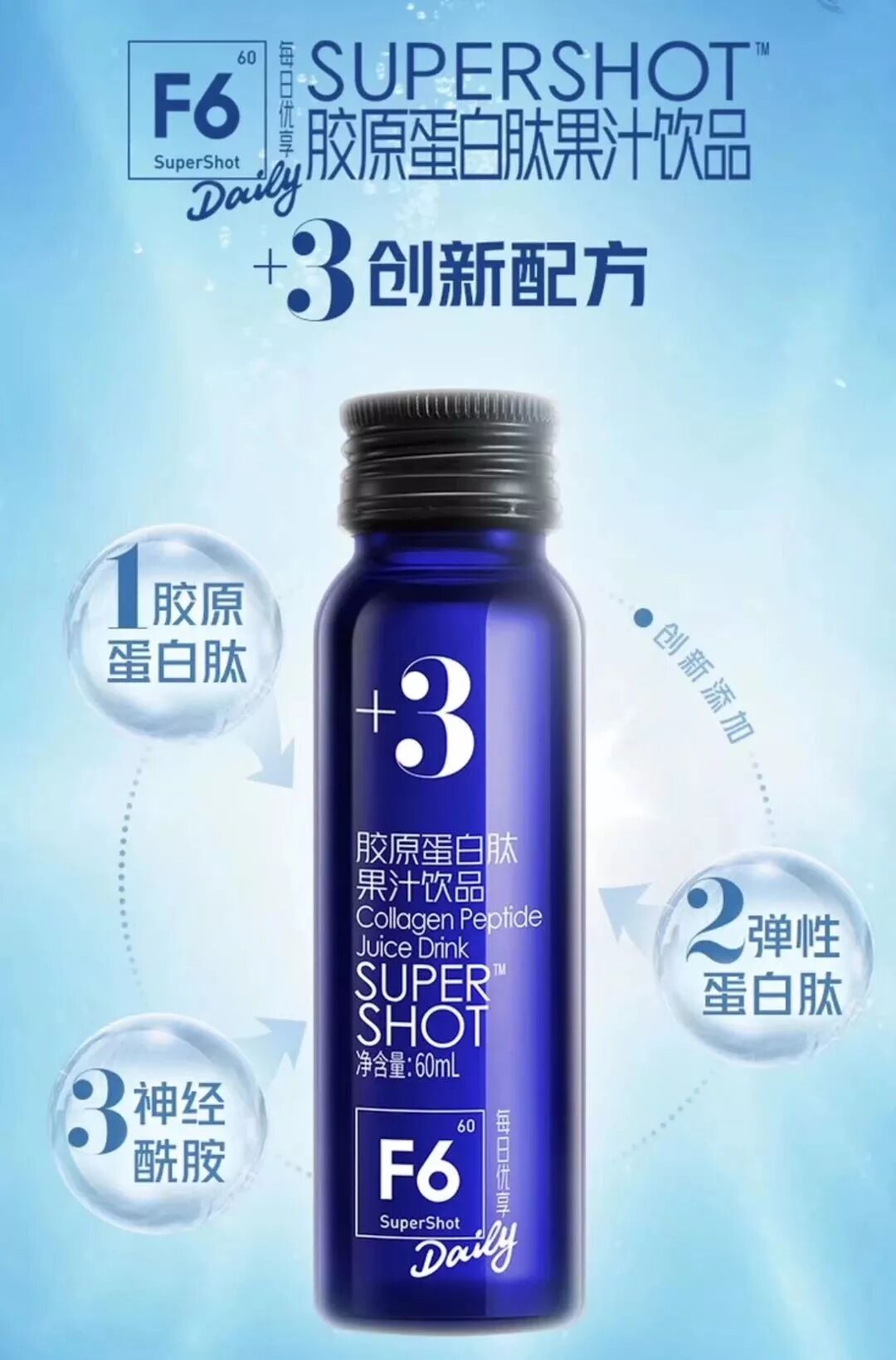 近日汤臣倍健旗下的F6也重磅推出了一款+3胶原蛋白肽果汁饮品,主打胶原蛋白肽、弹性蛋白肽、神经酰胺3大有效物质保持少女肌肤逆转颜值。