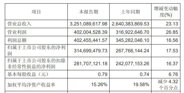 归属于上市公司股东的净利润为3.15亿元,比上年同期增长17.53%。基本每股收益为0.79元,比上年同期增长6.76%。主要原因是公司产品销售增加所致。