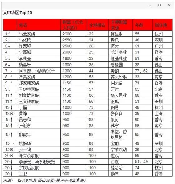 2月26日,据胡润研究院发布《2019胡润全球富豪榜》显示,马云以2600亿元成为全球华人首富,上升4位到第22位;马化腾和许家印紧随其后。