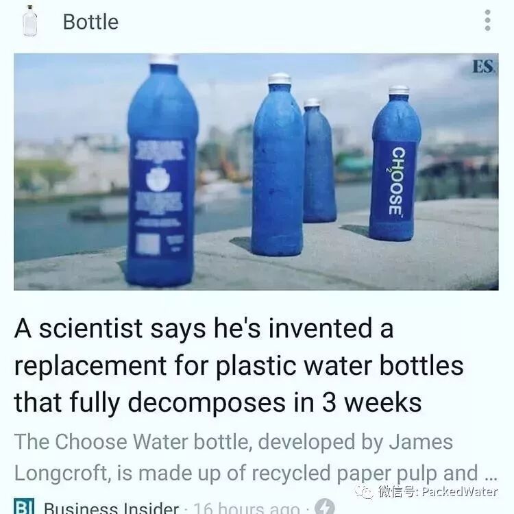 据加拿大广播公司报道,英国一家名叫Choose Water的公司设计出了一种纸质外壳,植物型防水内胆的瓶装水纸瓶。目前该公司正通过网上众筹资金的方式集资把这一环保瓶装水纸瓶推向商业化量产;公司筹集的资金将被用来购买机器设备、建立市场销售网络、与塑料瓶制造商竞争。