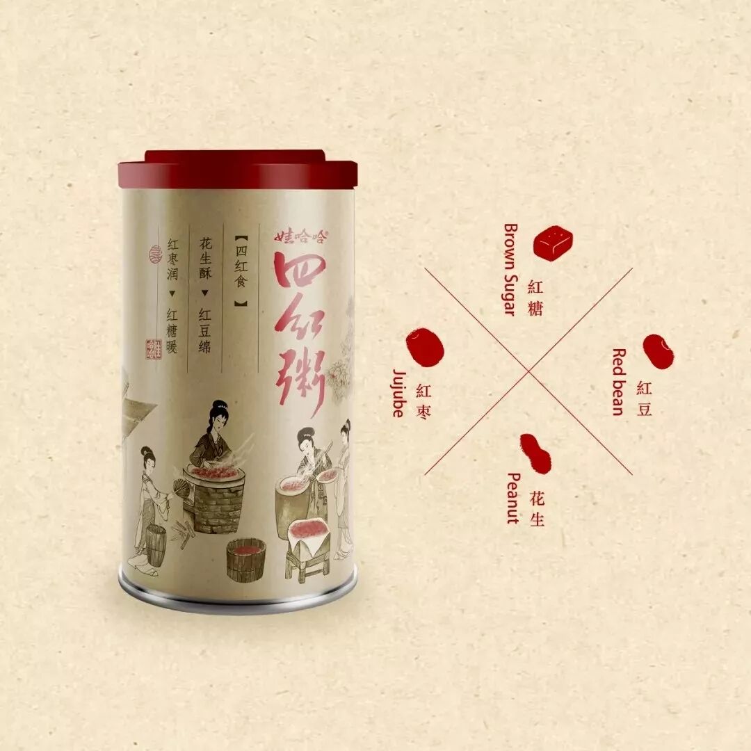 2019年新品养生即食粥。四红为红糖、红枣、红豆、花生四种食材,传承古方,适宜女性饮用。