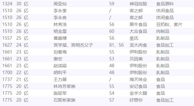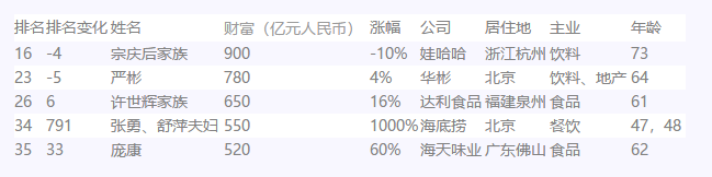 娃哈哈宗庆后家族900亿人民币均行业之首,位列榜单第16位,华彬创始人严彬以780亿位列食品饮料行业第2,为总榜单第23位。达利创始人许世辉家族以650亿位居第三,为总榜单第26位。