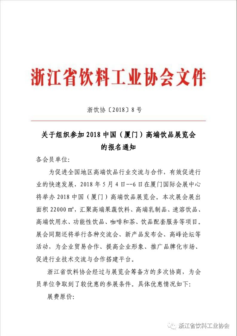 协会文件 关于组织参加2018中国(厦门)高端饮品展览会 的报名通知