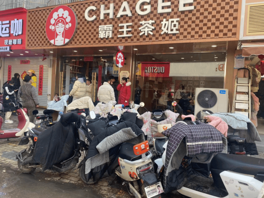 以安徽省界首市的“奶茶一条街”为例,大年初一价值星球走访时发现,古茗、蜜雪、霸王茶姬等多家新茶饮门店前,停满了两轮电动车和等待取餐的顾客。