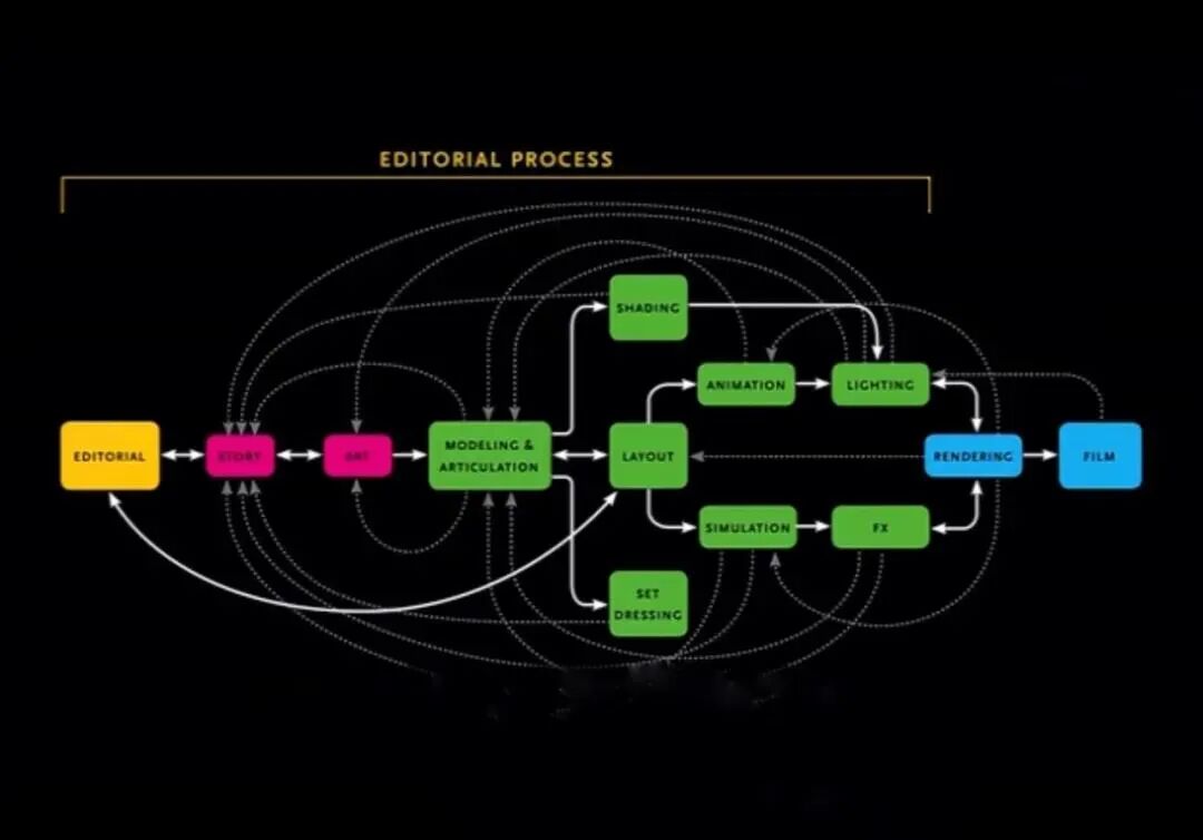 为了让我们明白这整个过程,一名工作室人员画了流程图,他画的时候很犹豫不决,因为这个过程是一系列紧凑的步骤,由一些独立的小组所完成。即使有这些箭头,他还是认为这并不能真正地告诉你们,这是一个涵盖如此大量重复性和高度关联性,以及说实话,相当杂乱的过程。