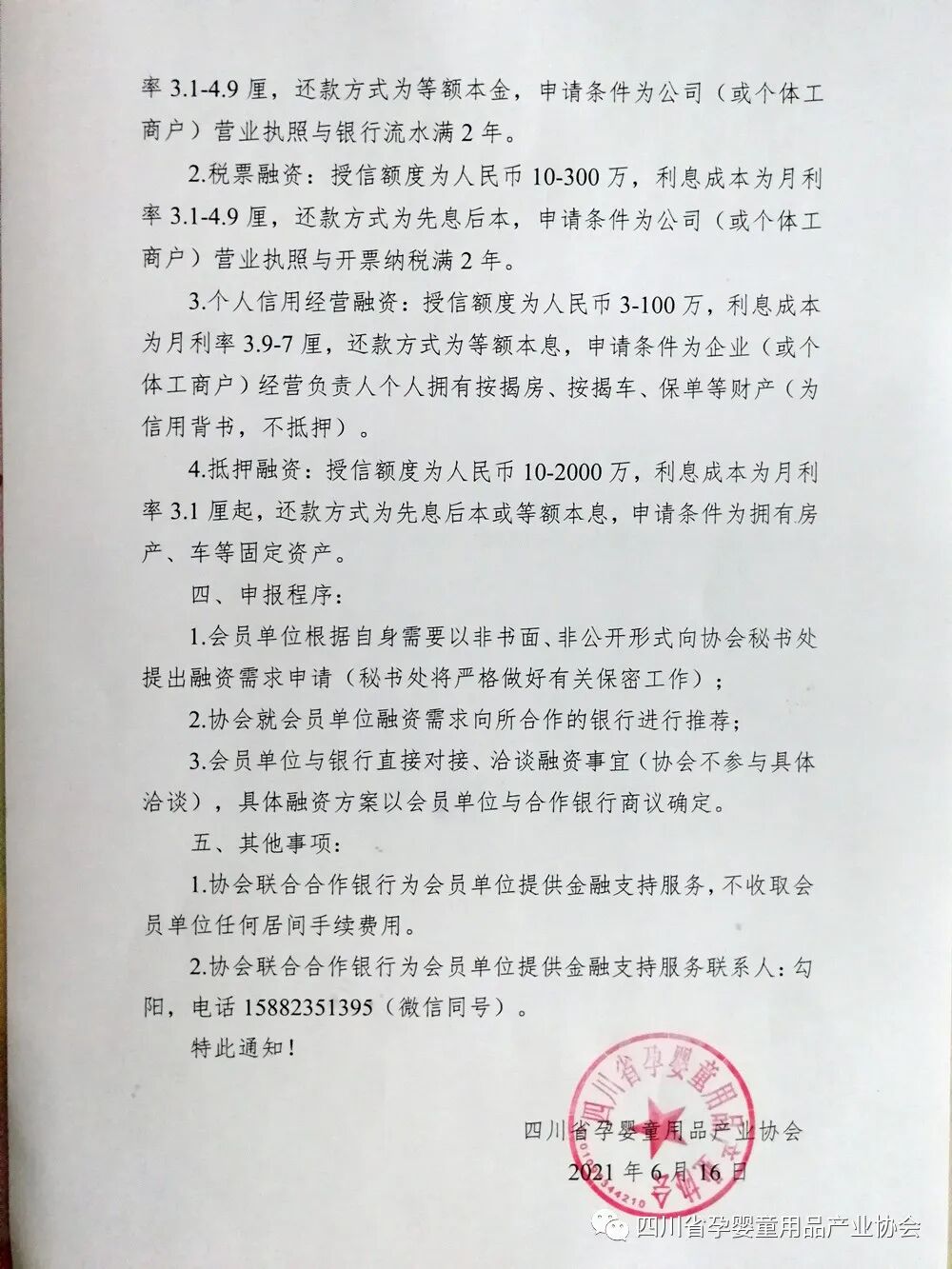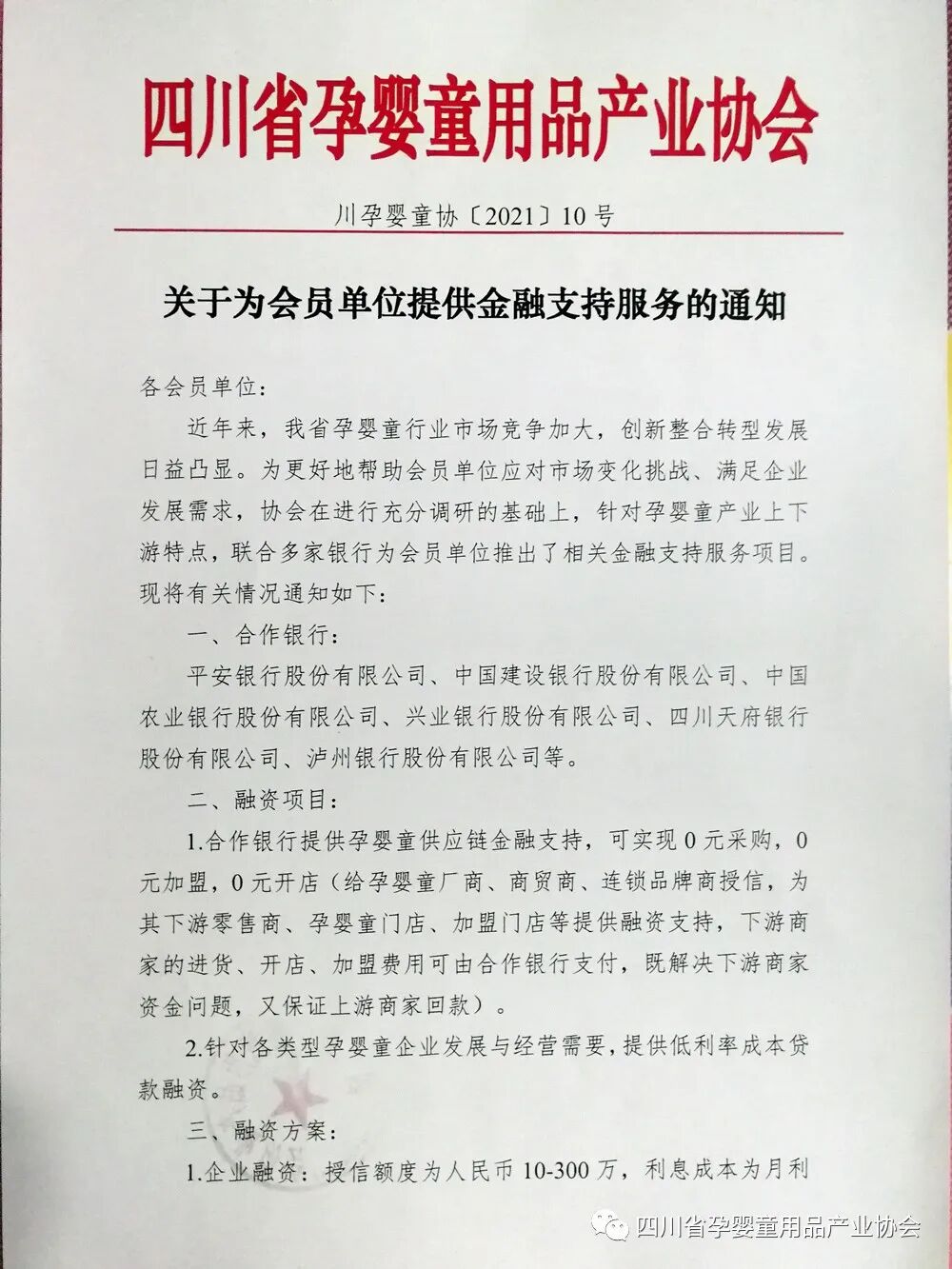近年来,我省孕婴童行业市场竞争加大,创新整合转型发展日益凸显。为更好地帮助会员单位应对市场变化挑战、满足企业发展需求,四川省孕婴童用品产业协会在进行充分调研的基础上,针对孕婴童产业上下游特点,联合多家银行为会员单位推出了相关金融支持服务项目。6月中旬,协会专门印发了《关于为会员单位提供金融支持服务的通知》(川孕婴童协〔2021〕10号),就相关事宜进行了公布,作出了安排。