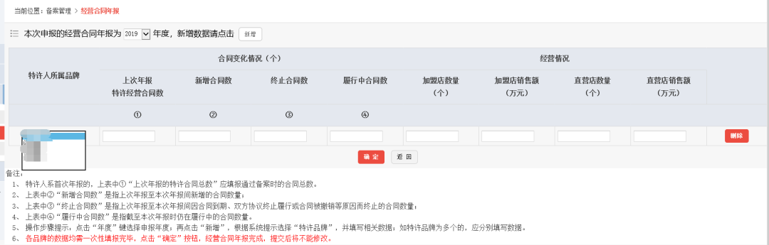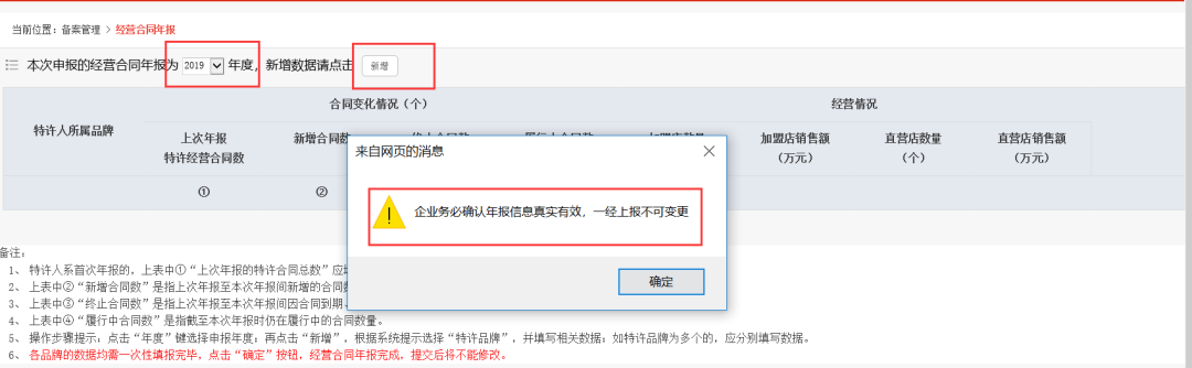 二、年报工作要求:企业用备案时获取的登录号和密码进入“商业特许经营信息管理系统”,自行按照“经营合同年报”表中的备注说明要求将上一年度订立、撤销、续签与变更的特许经营合同年报在系统中予以提交,并确认。(步骤:登入企业系统后台一点备案管理一经营合同年报一右上角新增数据一填写提交并确认)。