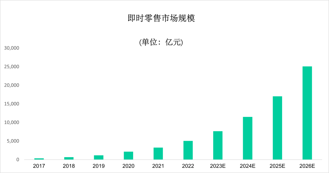 据中国商务部预测,到2022年,中国即时零售市场规模达到5042亿元人民币,年均增长50%以上,在社会消费品零售总额中的渗透率接近3%。预计2025 年,即时零售市场规模将达到2022年的3倍。