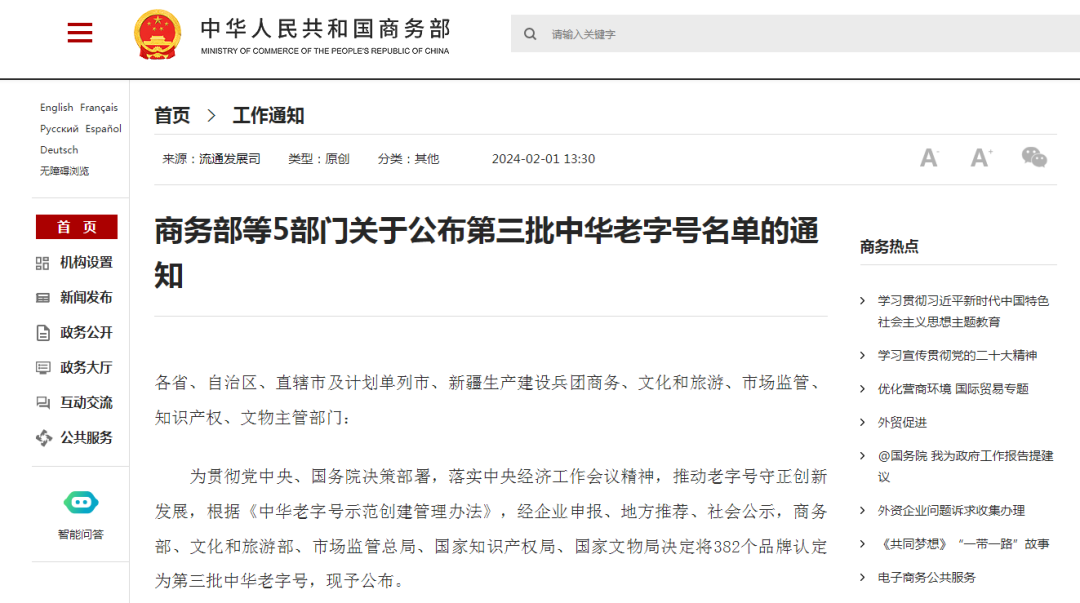 2月1日商务部等5部门发布关于公布第三批中华老字号名单的通知通知正式认定382个品牌为中华老字号全国老字号数量达到1455个