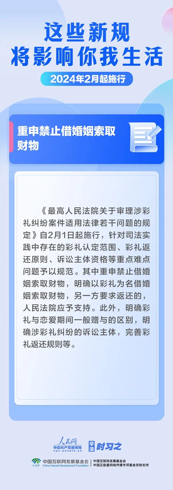 重申禁止借婚姻索取财物有效增加保障性和商业性租赁住房供应加强地理标志产品保护……2月起,这些新规施行将影响你我生活来源|人民网 薄