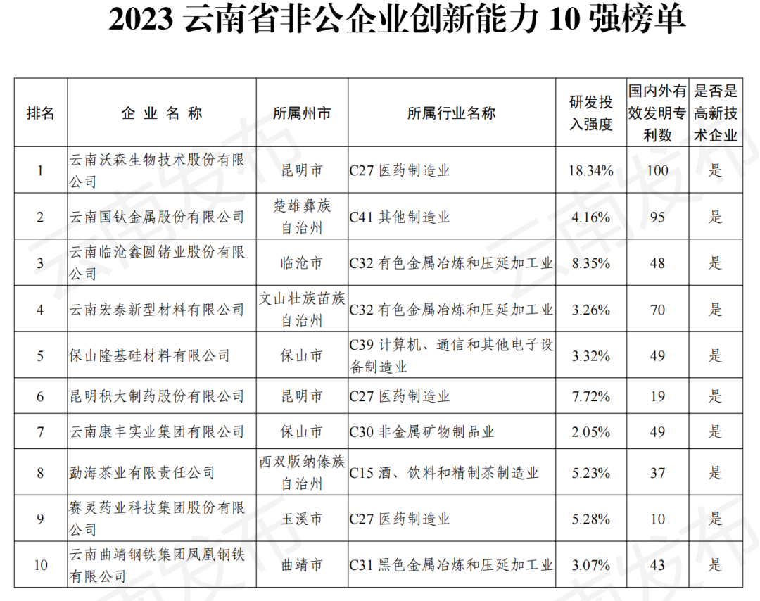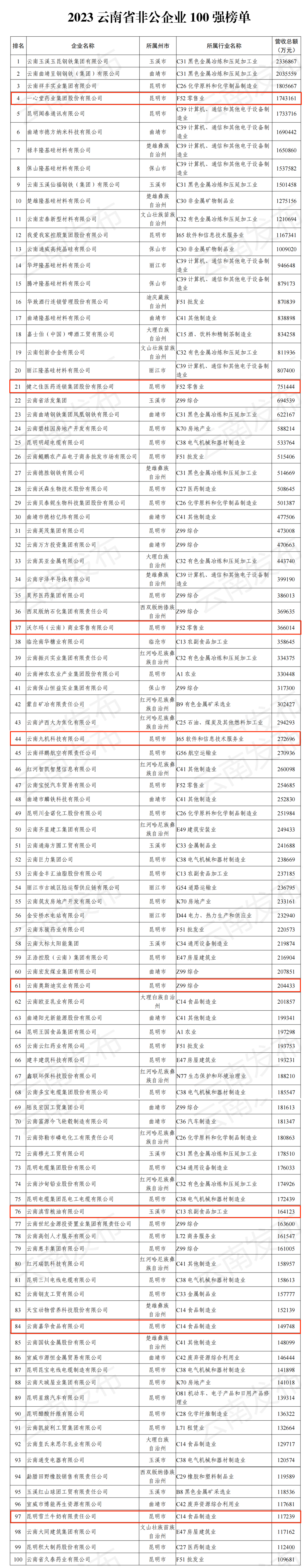 2023云南省非公企业100强榜单中,云南玉溪玉昆钢铁集团有限公司、云南曲靖呈钢钢铁(集团)有限公司、云南祥丰实业集团有限公司分列前三位。制造业20强入围门槛为51.47亿元,较上年增加16.57亿元,云南玉溪玉昆钢铁集团有限公司、云南曲靖呈钢钢铁(集团)有限公司、云南祥丰实业集团有限公司位居前三;服务业20强入围门槛为20.79亿元,较上年增加1.31亿元,前三位是一心堂药业集团股份有限公司、我爱我家控股集团股份有限公司、华致酒行连锁管理股份有限公司。同时,我爱我家控股集团股份有限公司、一心堂药业集团股份有限公司、健之佳医药连锁集团股份有限公司等入围“2023云南省非公企业吸纳就业10强”;云南沃森生物技术股份有限公司、云南国钛金属股份有限公司、云南临沧鑫圆锗业股份有限公司入围“2023云南省非公企业创新能力10强”。