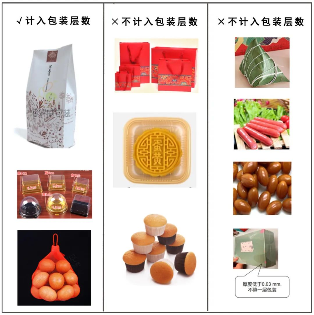粮食及其加工品、月饼及粽子的包装层数不应超过三层,其他商品(如茶叶)不应超过四层。
