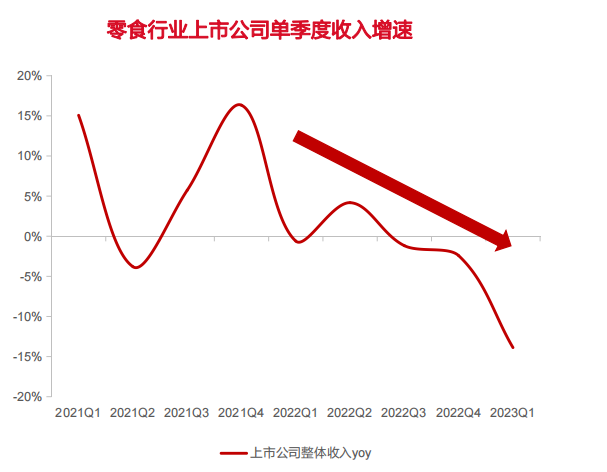 据下图所示,近年来,零食行业上市企业的单季度收入总体呈现下滑趋势,2023年一季度的营收增速则呈现巨大的负增长,股价一度纷纷腰斩。