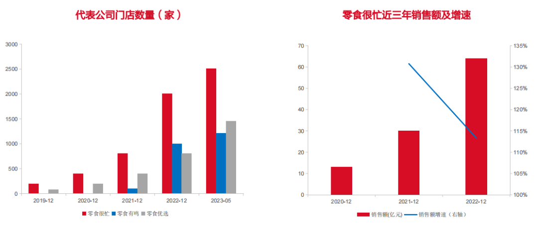 与此同时,一大批零食量贩店纷纷崛起,零食很忙、零食有鸣、赵一鸣零食、爱零食等,整体开店数量已经突破了1万家。