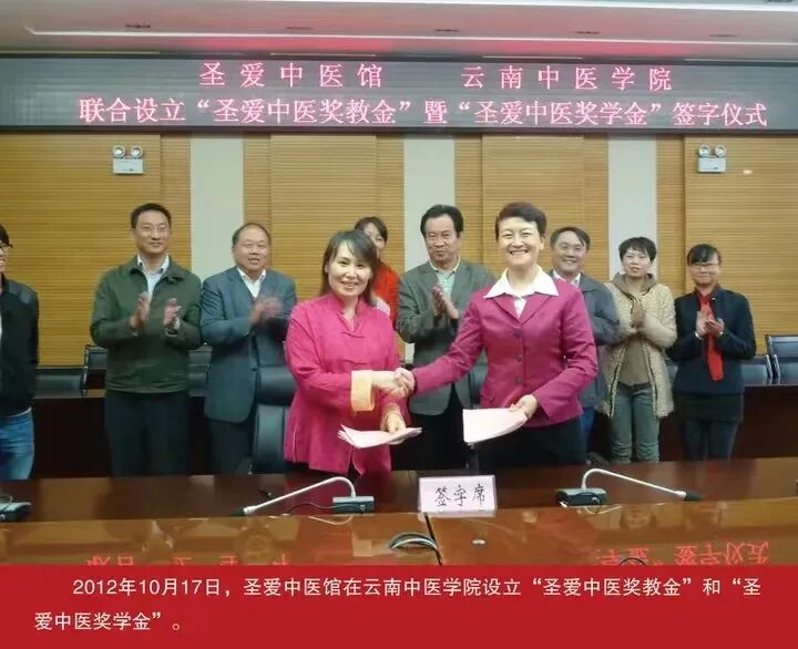 10月17日,在云南中医药大学设立永久有效的“圣爱中医奖教金”和“圣爱中医奖学金”(圣爱是云南中医药大学中医药临床带教基地)。