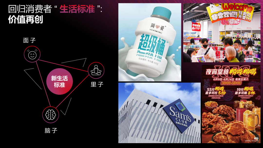 现今,最火的产品是什么?一升冰美式等各种量贩装的产品。简爱的超级桶推出几个月,现在每个月销量两千万;肯德基推出的夜宵畅吃畅喝广受欢迎。为什么?因为高品质、有里子的产品,性价比更加高。