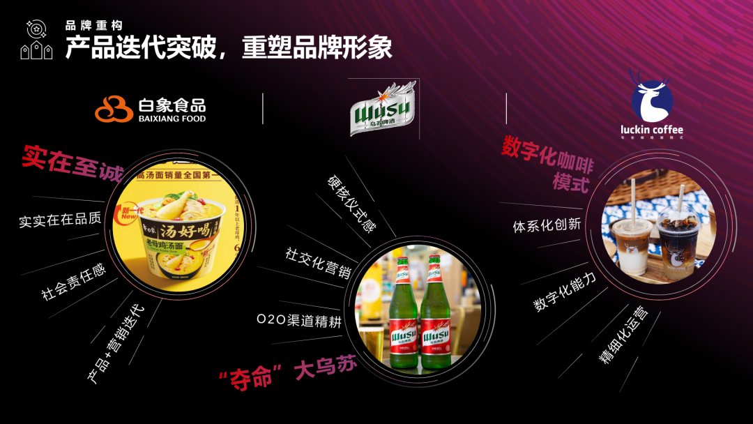 白象、乌苏、瑞幸可能都是过去两年非常成功的品牌重构的案例。白象从一个低线品牌、甚至看上去有点“土”的品牌,突然变成了国潮;乌苏走出疆外;瑞幸三年开始完全翻盘,成为了新瑞幸。