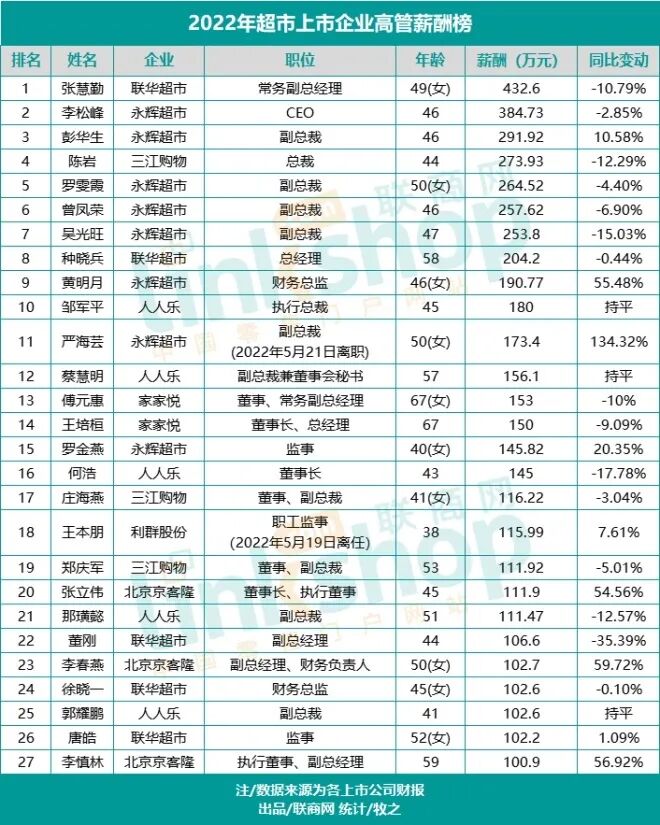 当然,企业高管的薪酬也与业绩息息相关。超市业态2022年业绩普遍承压,高管薪酬相比2021年出现不同程度的下降。其中,27名高管中,有15名出现同比下降,联华超市副总经理董刚降幅度最大,同比下降35.39%;有3名高管与2021年持平;有9名高管的薪酬出现同比提升,永辉超市原副总裁严海芸升幅最高,达134.32%,不过其已于2022年5月21日离职。